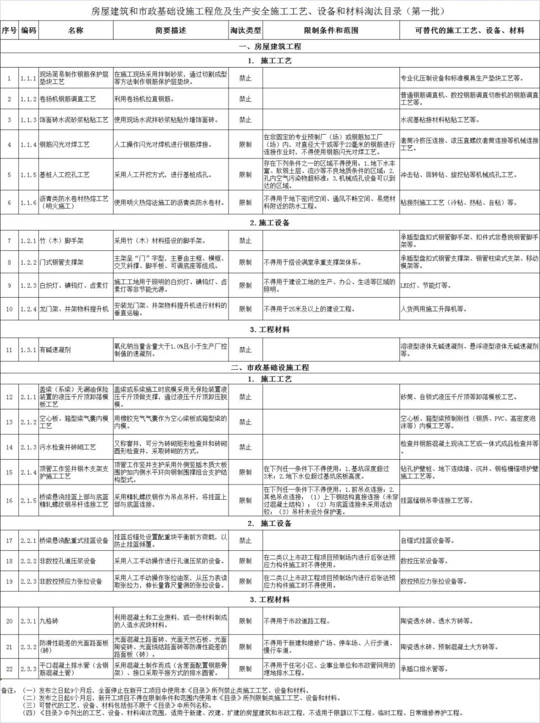 2022年9月15日后,全面停止在新開(kāi)工項(xiàng)目中使用《目錄》所列禁止類施工工藝、設(shè)備和材料。