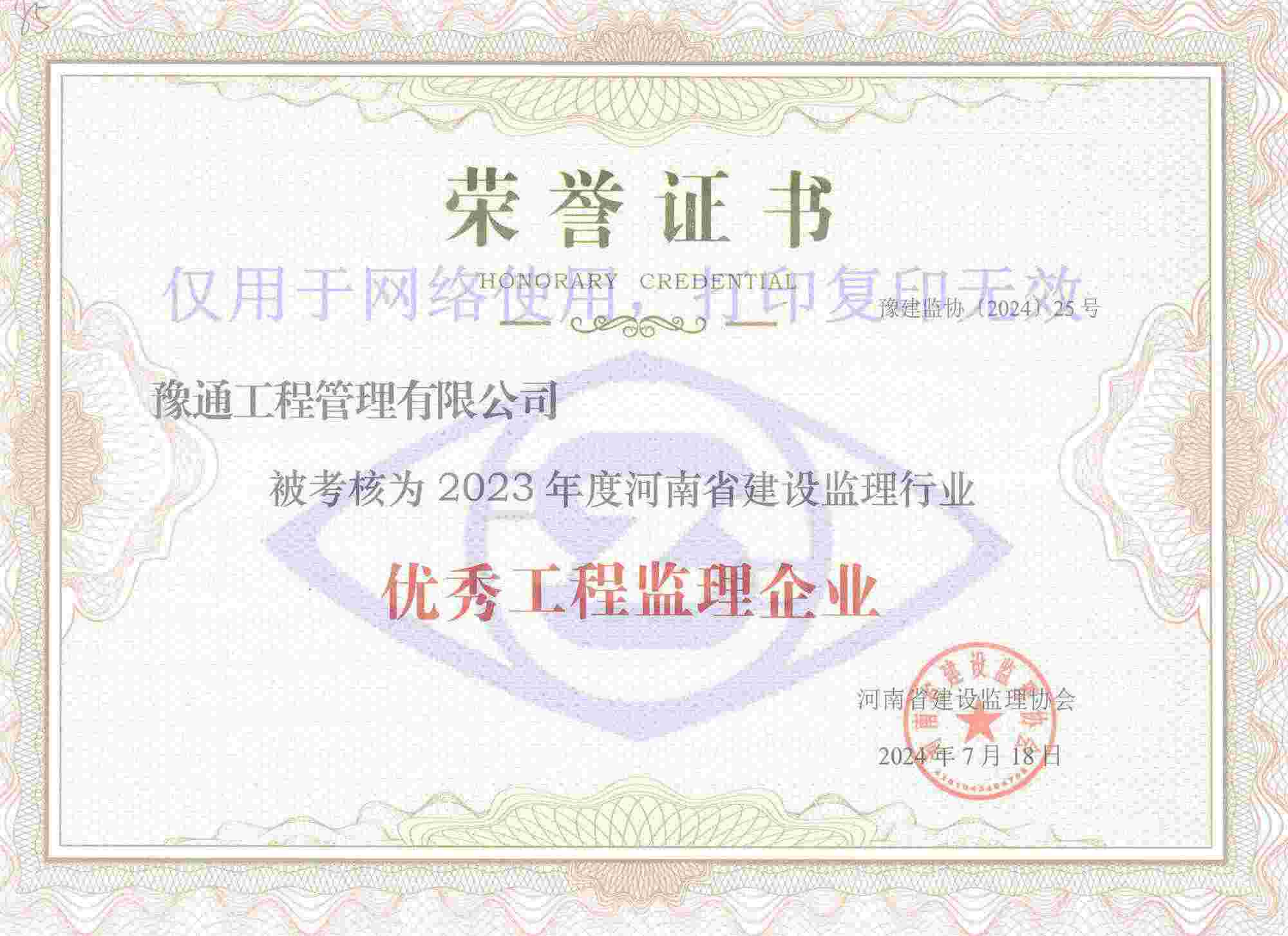 近日,河南省建設(shè)監(jiān)理協(xié)會(huì)發(fā)布了關(guān)于公布2023年度會(huì)員單位考核結(jié)果的通知(豫建監(jiān)協(xié)〔2024〕25號(hào)),我公司榮獲“2023年度優(yōu)秀工程監(jiān)理企業(yè)”稱號(hào)。