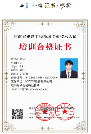 完成全部培訓(xùn)課程并通過考核的人員,河南省建設(shè)工程質(zhì)量監(jiān)督檢測行業(yè)協(xié)會、河南省建設(shè)監(jiān)理協(xié)會聯(lián)合發(fā)放見證員、送樣員、取樣員培訓(xùn)合格電子證書,該證書可作為從業(yè)人員上崗和執(zhí)業(yè)的資格證明。、